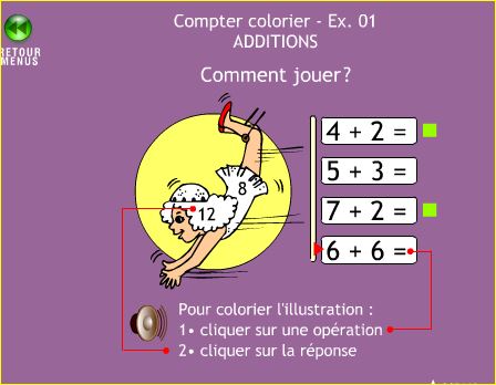 Vamos a emplear en clase un Juego en francés, pero perfectamente entendible, en el que coloreas los personajes haciendo pequeñas sumas.
